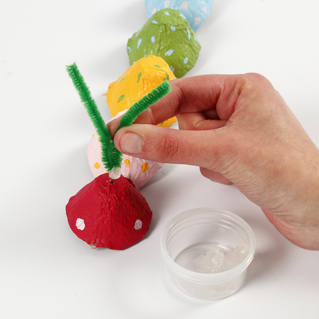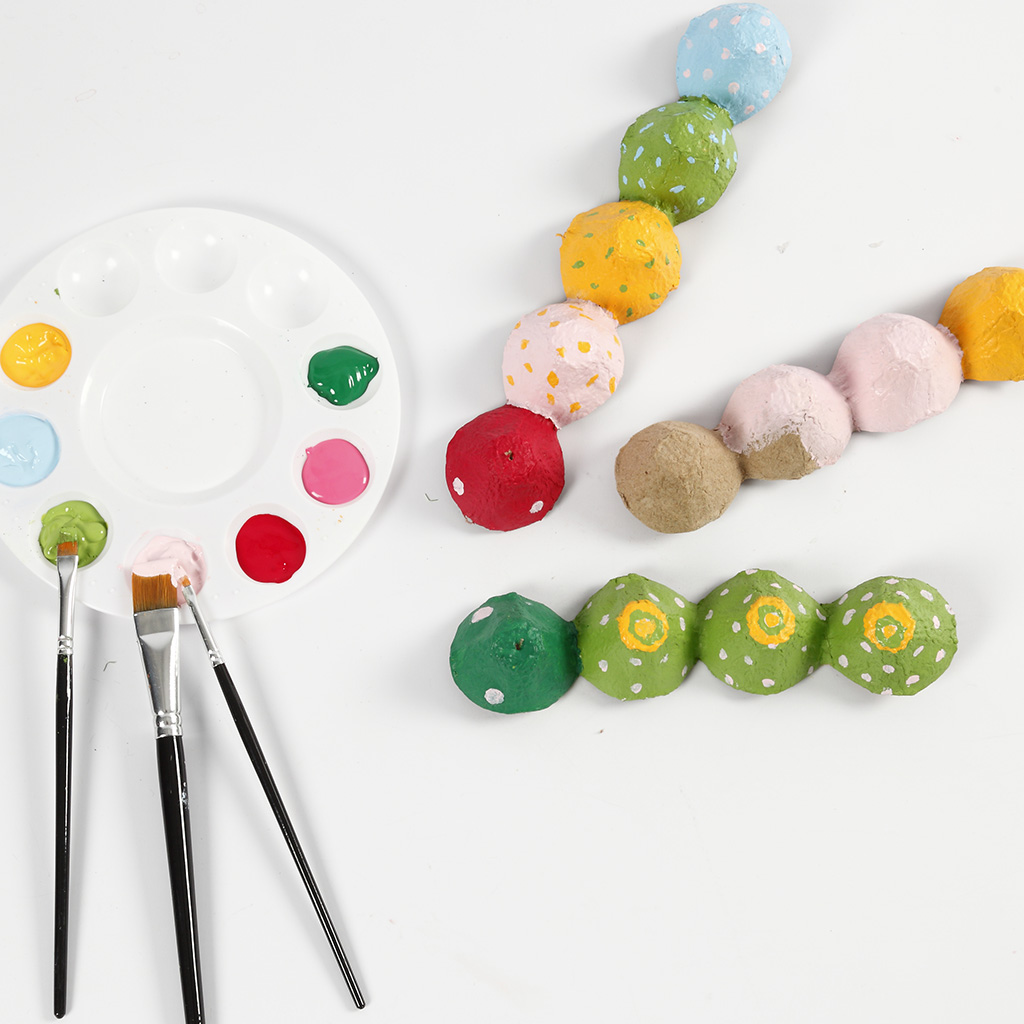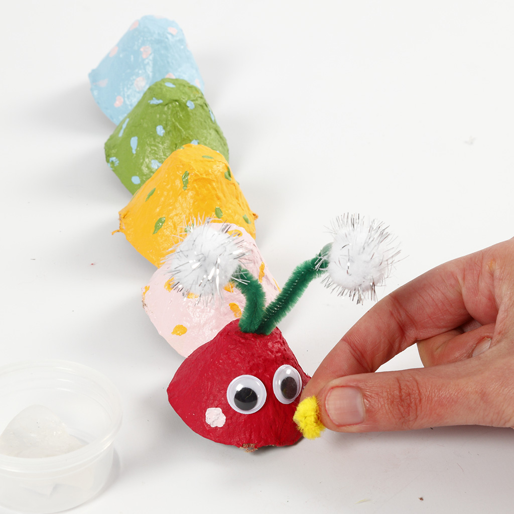 Gör söta larver av äggkartonger, färg, rullögon, pompomer, piprensare m.m. Alla delarna limmas på med Sticky Base, så barnen inte behöver använda en varm limpistol.