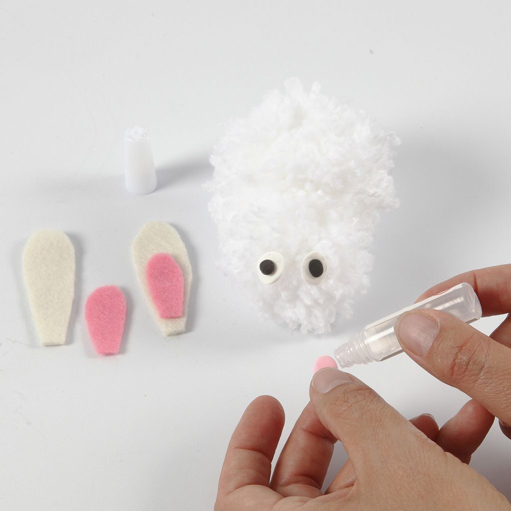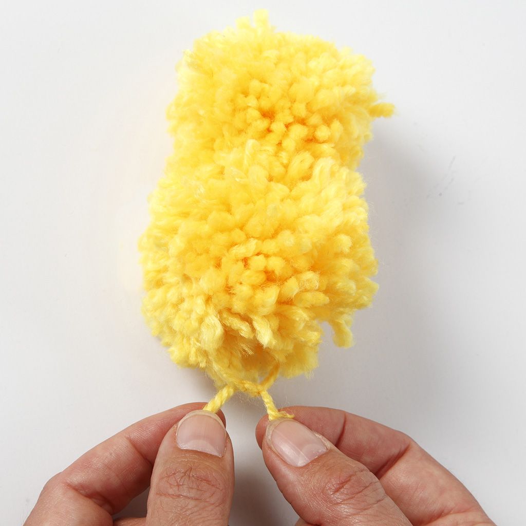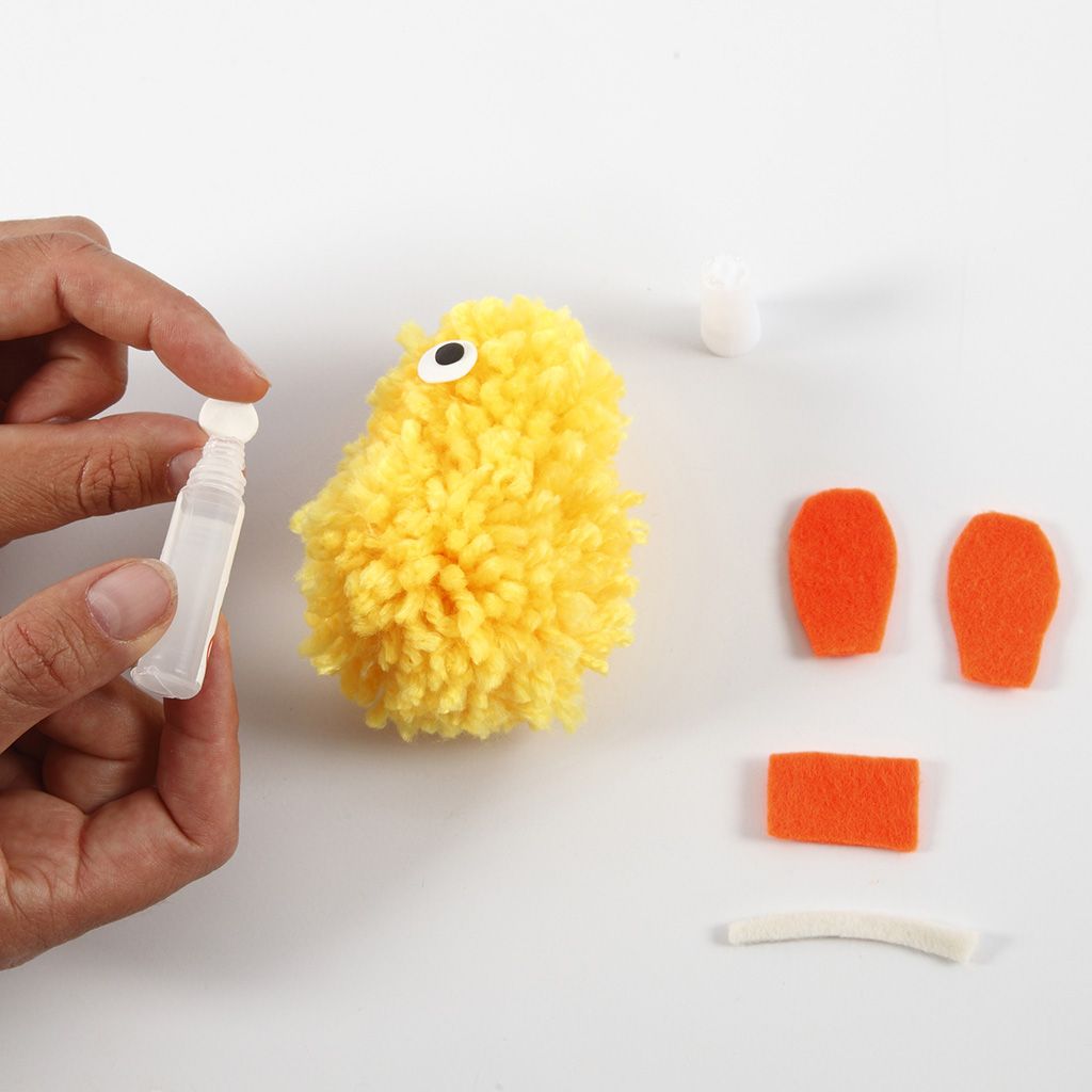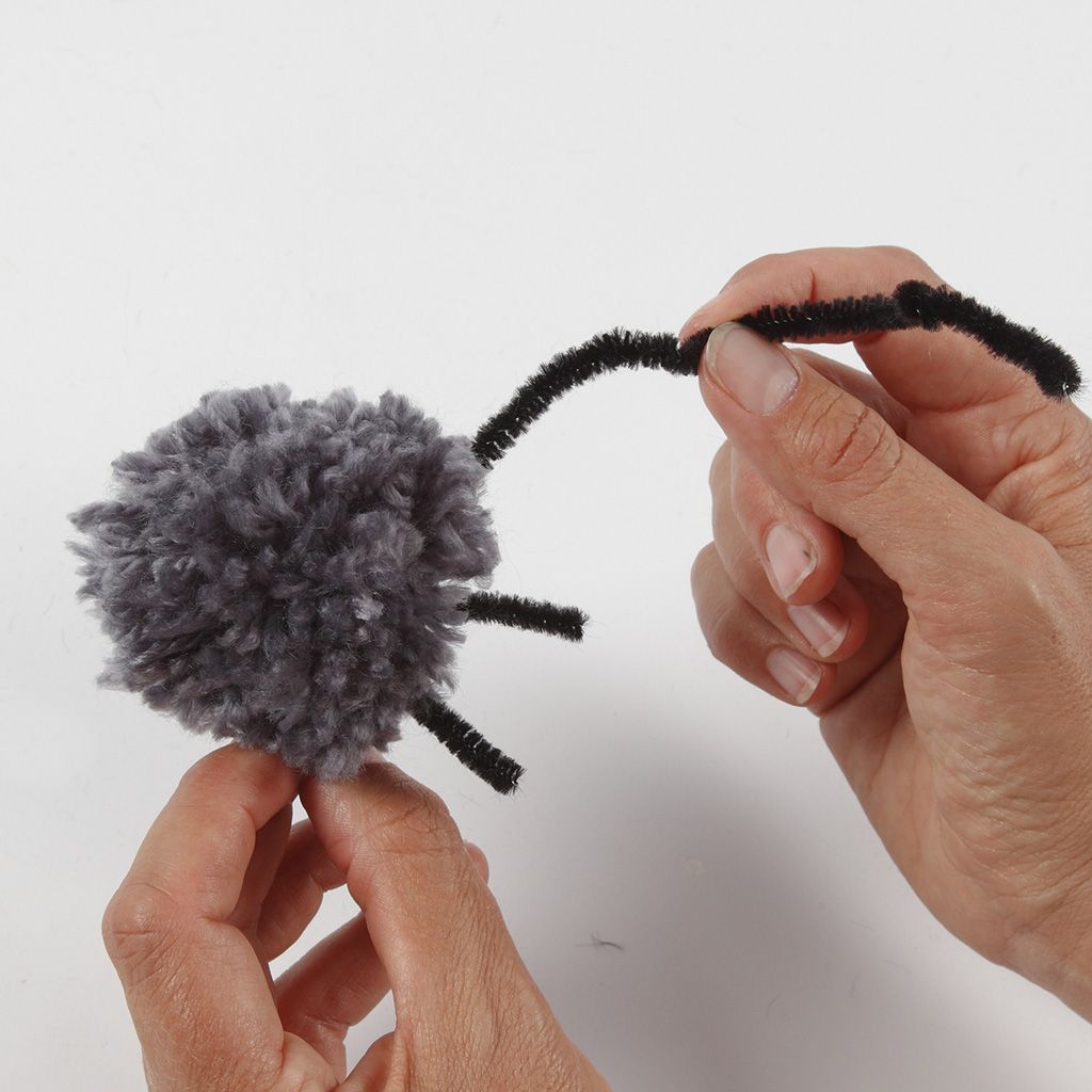 Vira garn runt pompomverktyget och knyt ihop garnet så det bildas en pompom. Limma på delarna som klippts ut i filt och de som formats av silk clay Till sist träs piprensare genom kroppen och klipps i önskad längd.
