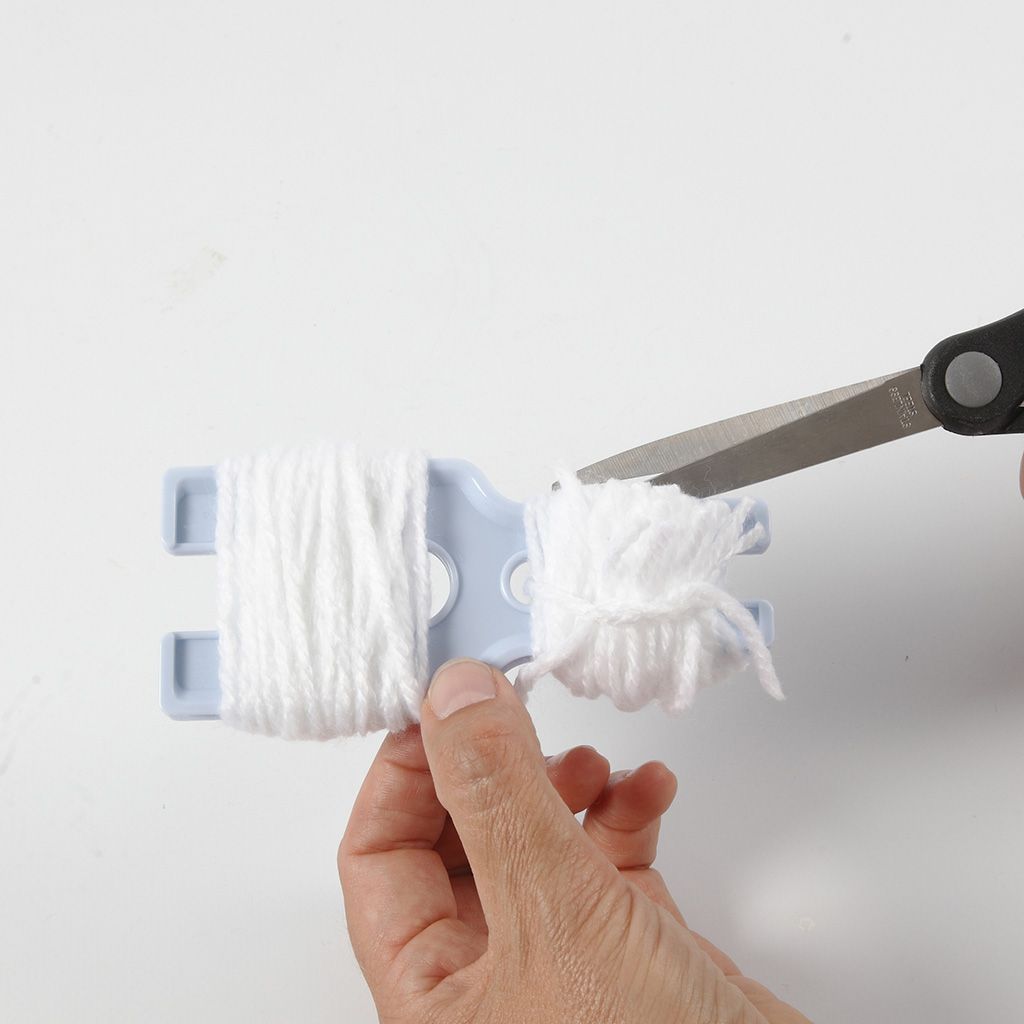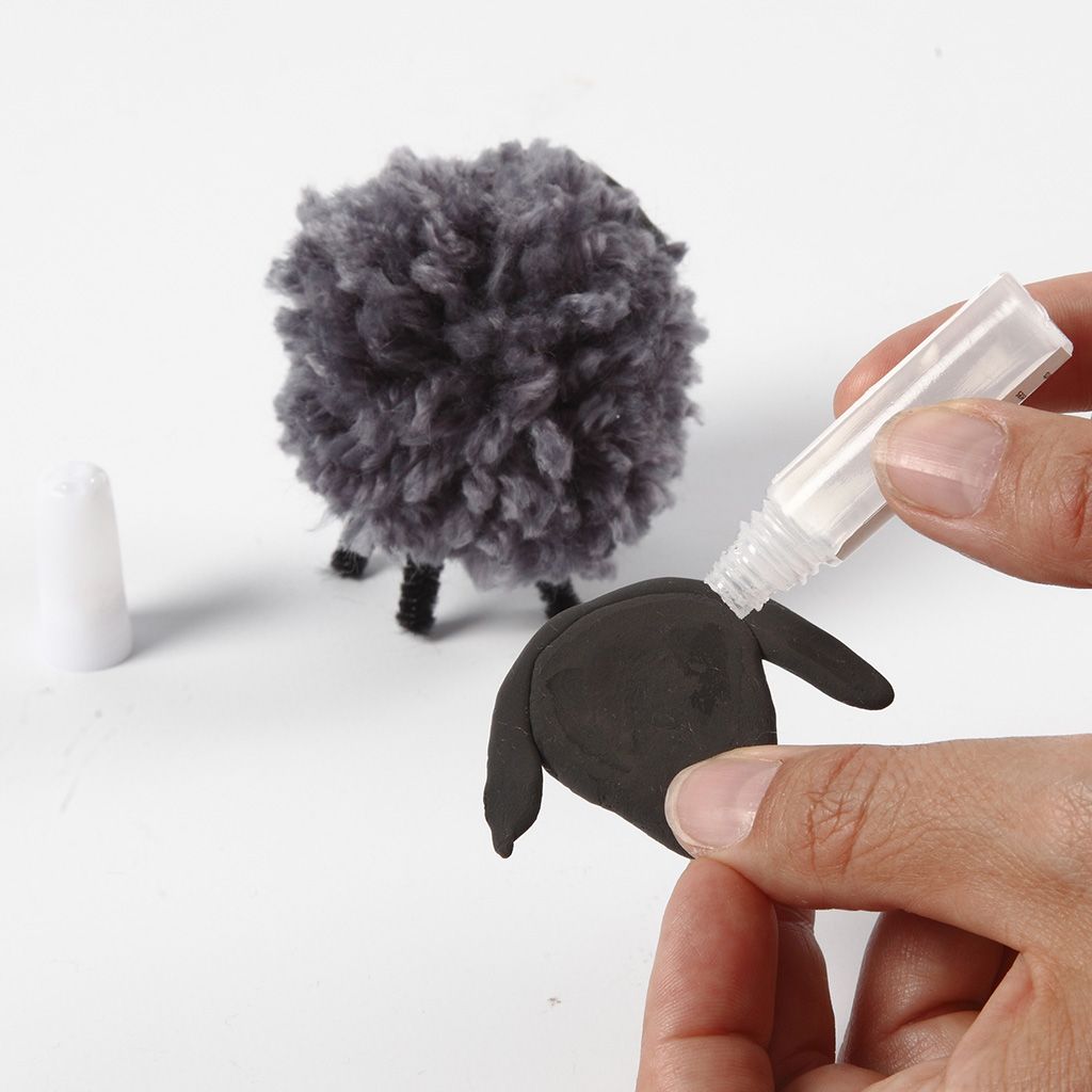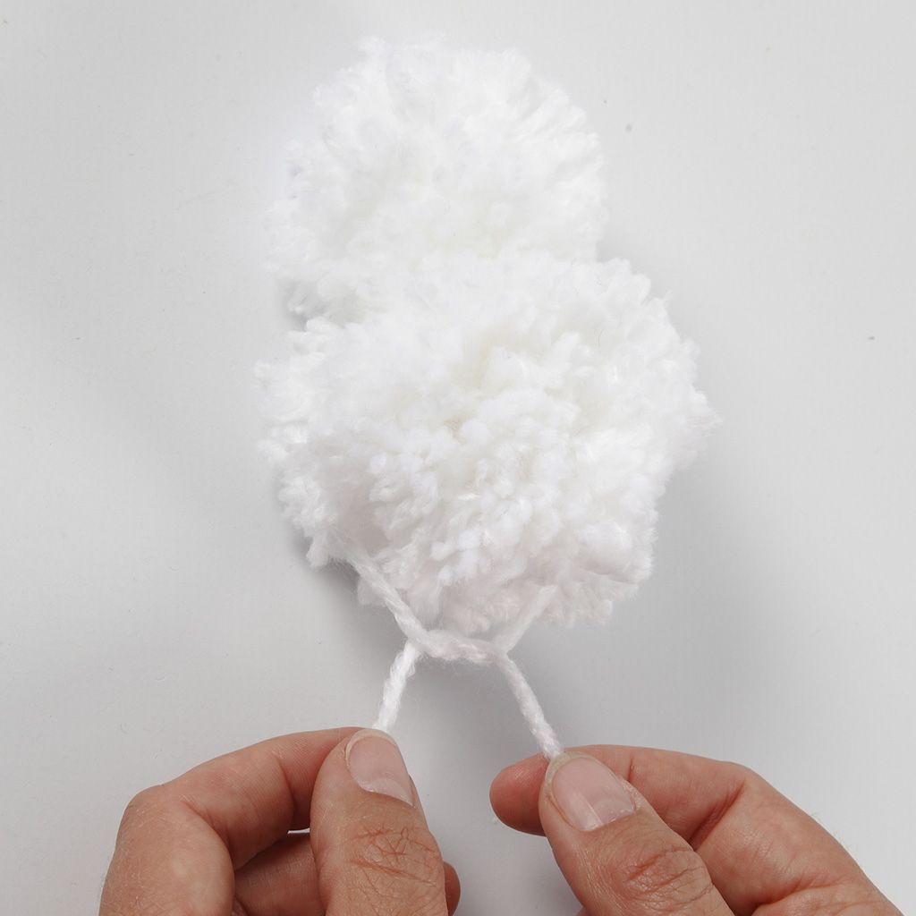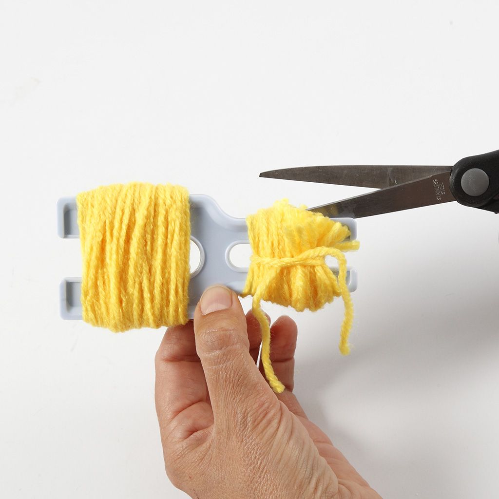 Vira garn runt pompomverktyget och knyt ihop garnet så det bildas en pompom. Limma på delarna som klippts ut i filt och de som formats av silk clay Till sist träs piprensare genom kroppen och klipps i önskad längd.