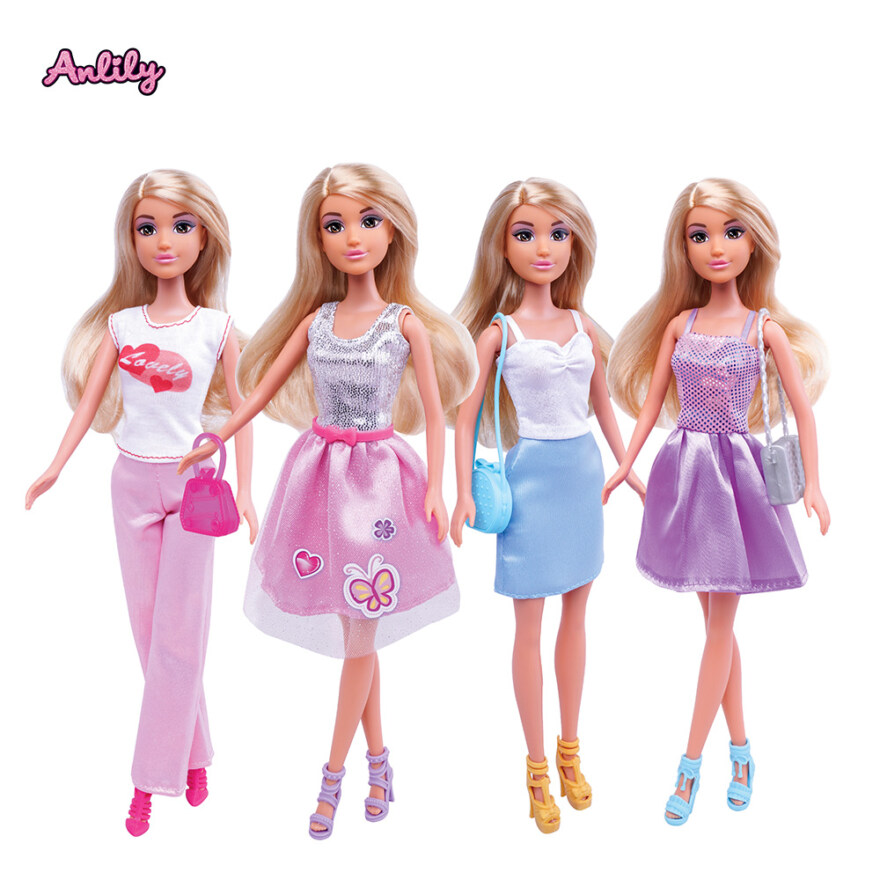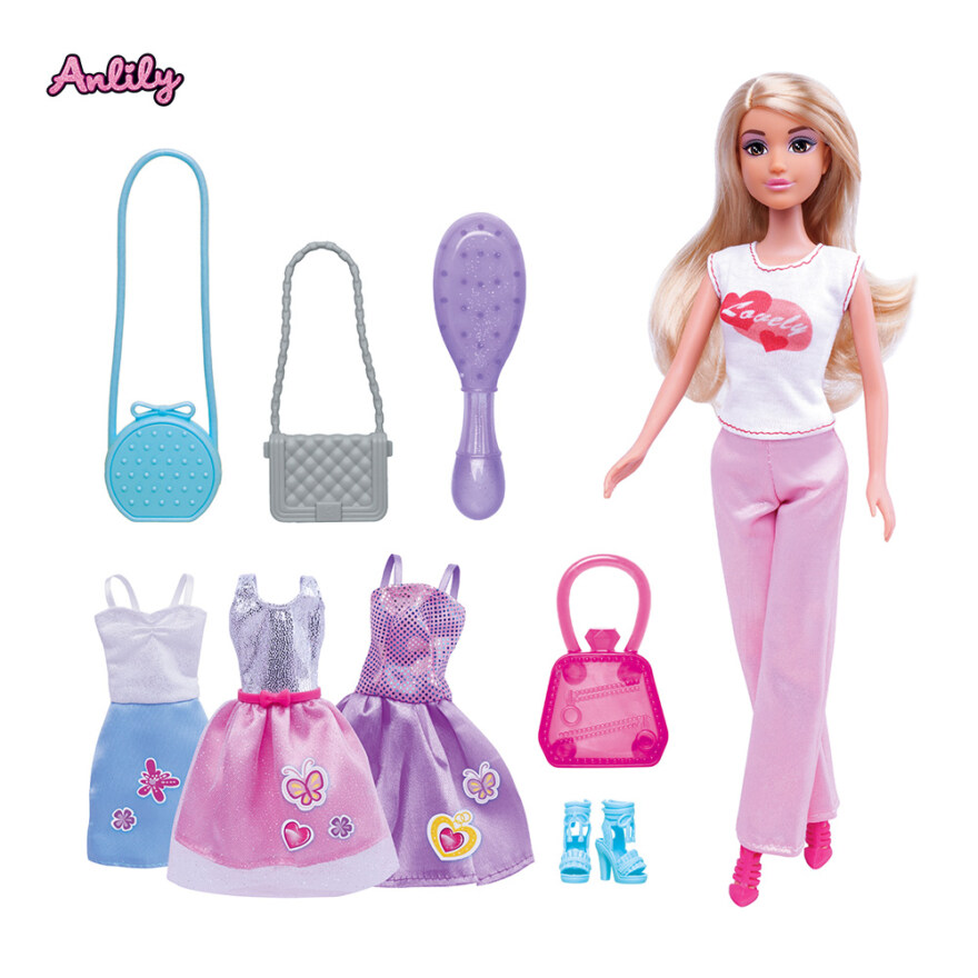 Anlily med kläder. Skapa unika outfits och låt kreativiteten flöda med detta Anlily-set! Setet innehåller en Anlily-docka, tre extra klänningar i olika färger och mönster, tre par skor, två väskor och ett klistermärkesark för att dekorera och designa kläderna.