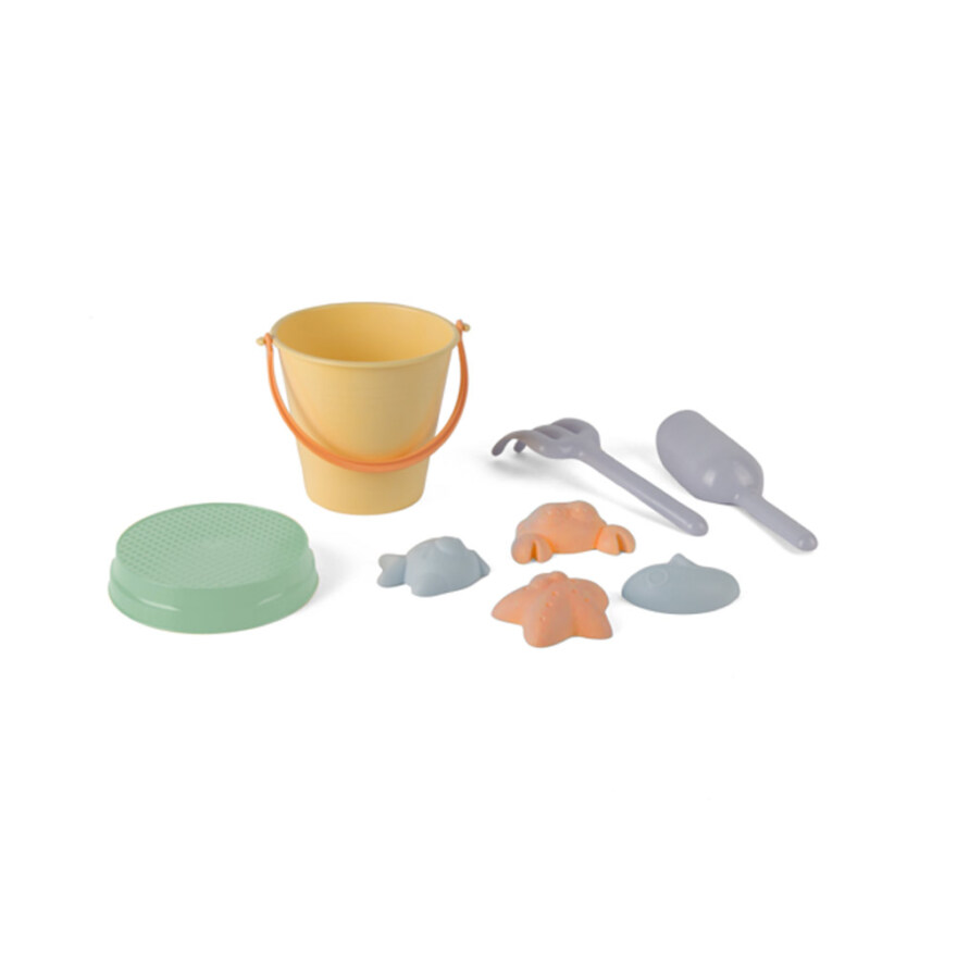 Återvunnet hinkset i nät - Komplett sandset i 100 % återvunnen plast. Innehåller hink, spade och sandformar i mjuka pastellfärger. Perfekt för strand, trädgård och sandlåda.