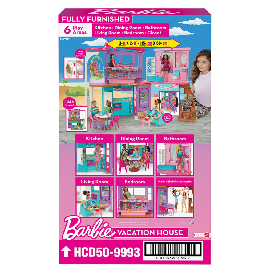 Ta med fantasin på drömsemester i Barbie Vacation Malibu House och lek i två våningar fulla av roliga överraskningar. Öppna huset och utforska sex rum – sovrum, badrum, kök, matsal, vardagsrum och garderob. Gunga i hissgungan, fäll ner väggen för filmkväll eller födelsedagsfest och skapa egna berättelser i varje hörn. Möblera med de många tillbehören, lek med den söta valpen och vik ihop huset när äventyret är över.