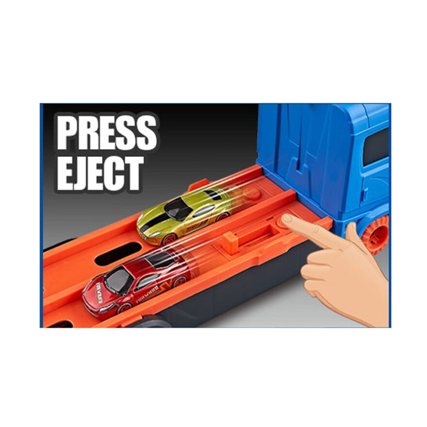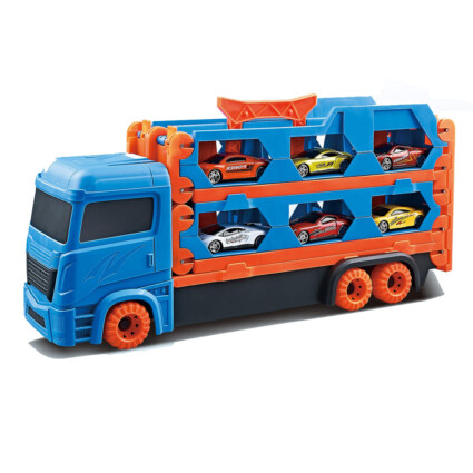 Kör ut på vägarna med biltransporten som vecklas ut till en 1,65 meter lång bilbana. Lasta upp till 18 bilar, fäll ut rampen och starta racet direkt. Lek med de två medföljande bilarna och skapa actionfyllda biläventyr var du än är.