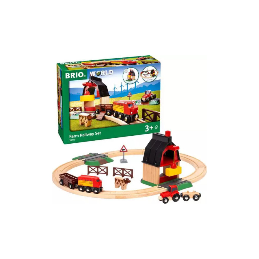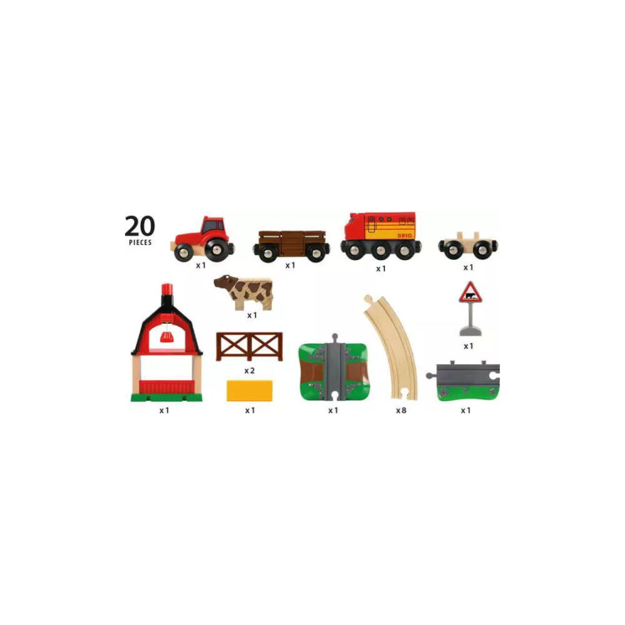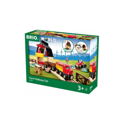 Brio tågbana bondgård - Ute på gården lever hästen och kon lugnt och skönt på betet, medan traktorn lastar hö i ladan. Lyft höet upp på loftet med kranen. Ta in djuren, låt dem gå upp i vagnen via den nedfällda rampen, och transportera dem sedan med bondgårdståget.