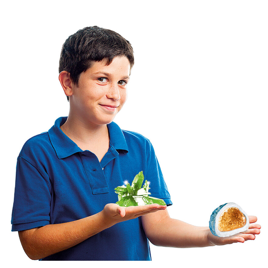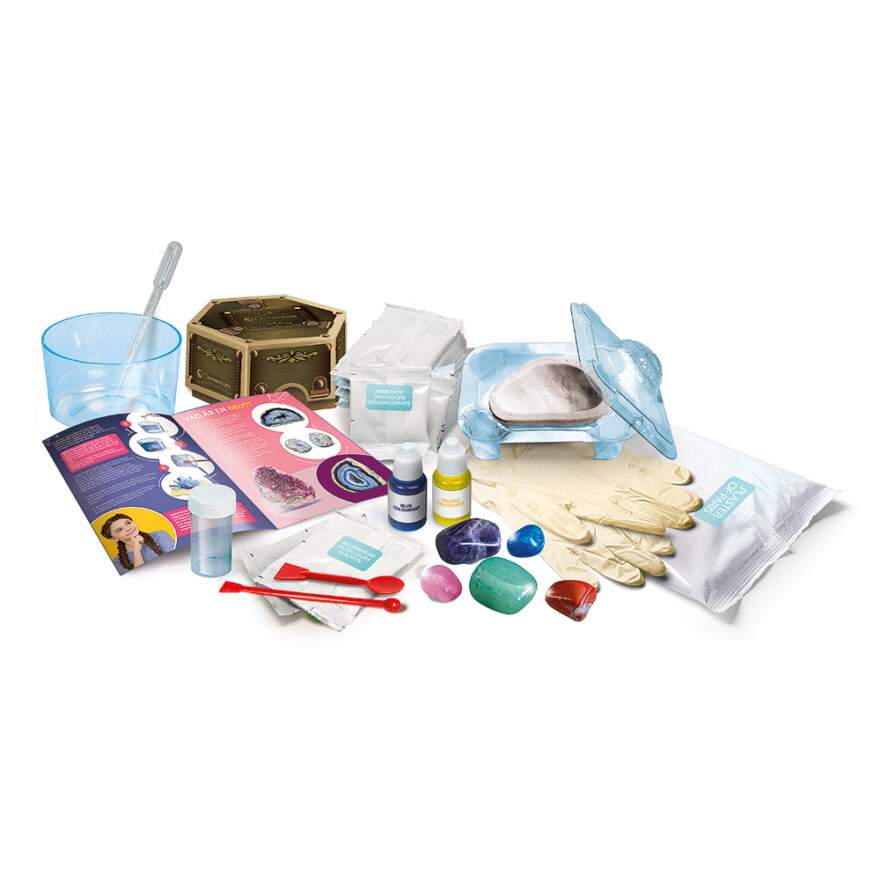 Giant Crystals & Precious Stones låter dig utforska vackra ädelstenar och en fascinerande färgad geod. Setet ger dig allt du behöver för att odla en gigantisk kristall och upptäcka hur kristaller växer fram. Det bjuder på en lärorik och spännande upplevelse för alla som gillar naturvetenskap och mineraler.