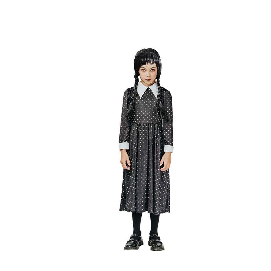 Gothic Girl - S (110-120 cm) Förvandla dig till en gotisk ikon med denna stilfulla dräkt! Setet innehåller en svart klänning med vita prickar och en elegant vit krage. Perfekt för maskerader, Halloween eller temafester – denna dräkt ger dig en unik och mystisk look. Peruk och strumpbyxor ingår ej. Gör dig redo att skrämma både vänner och familj!