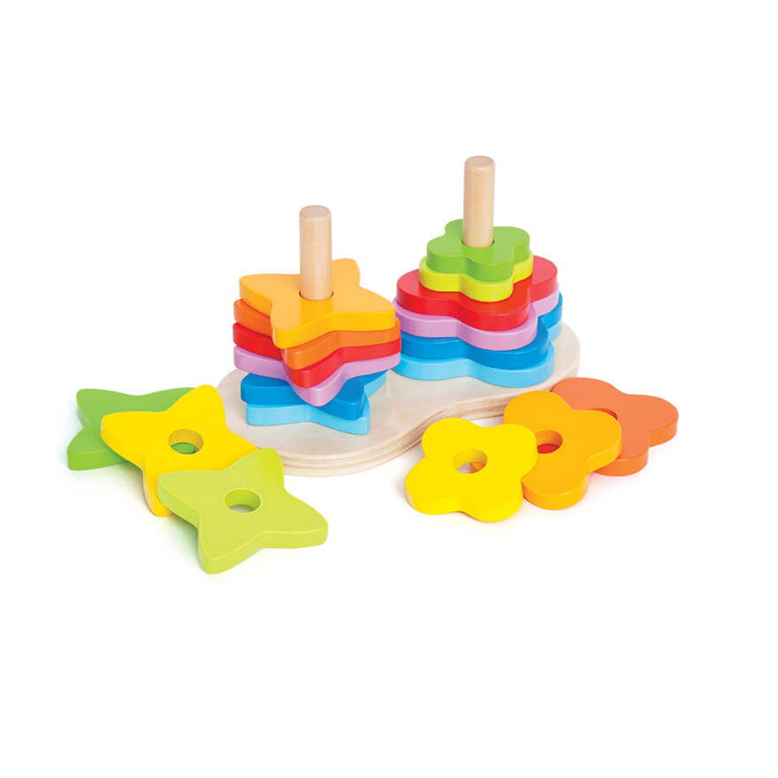 Hape Double Rainbow Stacker. Bygg, lek och lär med denna färgglada stapel leksak med blom- och stjärnformer. Med nio färger och två olika former kan barn skapa spiraler och unika kombinationer varje gång de leker.