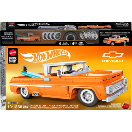 Hot Wheels Brick Shop Elite Series Custom 62 Chevy låter dig bygga en detaljerad modell av en klassisk pickup i 1:16-skala med autentiska och stilrena detaljer. Montera bilen steg för steg, anpassa designen med extra delar och visa upp den synliga motorn för en realistisk känsla. Dekaler, metallfälgar och signaturplatta ger modellen ett exklusivt utseende som passar perfekt både för lek och samling.
