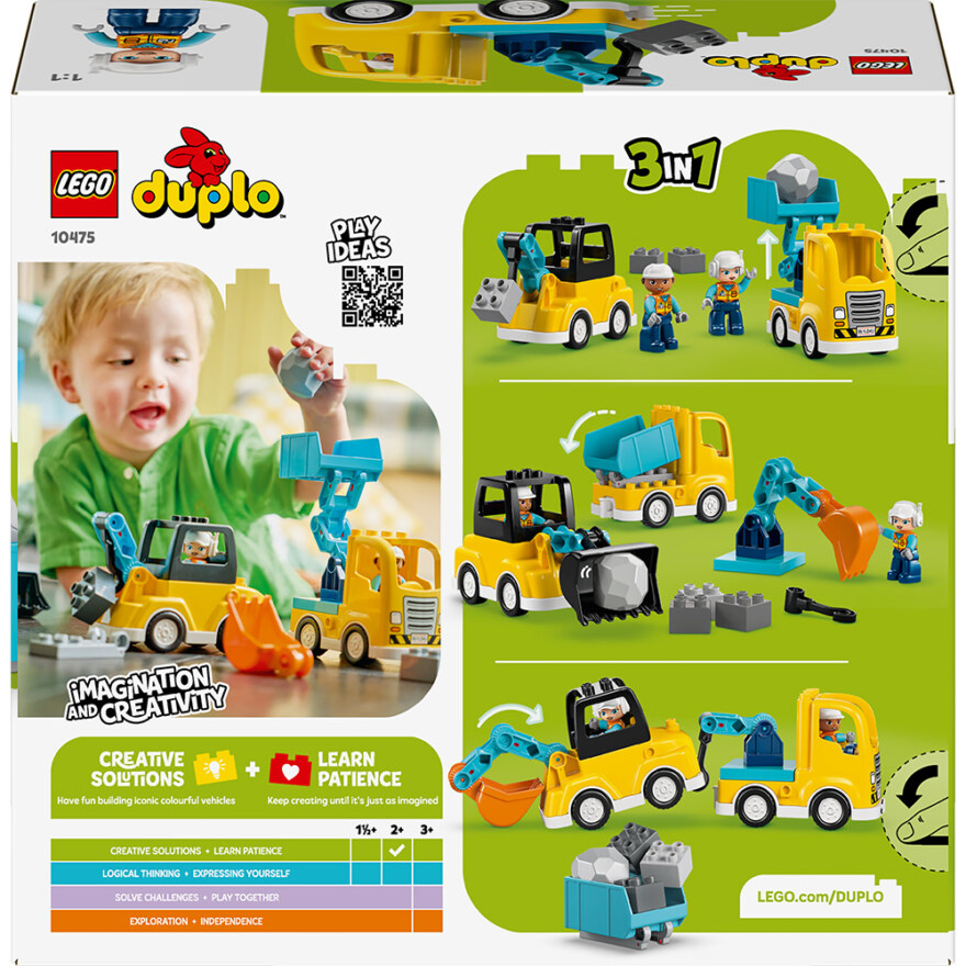 LEGO 10475 3 i 1 Byggfordon ger små barn en kreativ och varierad bygglek. Barnet kombinerar klossarna och skapar olika arbetsfordon genom aktiv lek. Setet låter barnet bygga om fordonen och testa nya lösningar. Figurerna inspirerar till berättelser och rollspel på byggarbetsplatsen. Leken utvecklar fantasi, motorik och problemlösning på ett lekfullt sätt från LEGO Group.