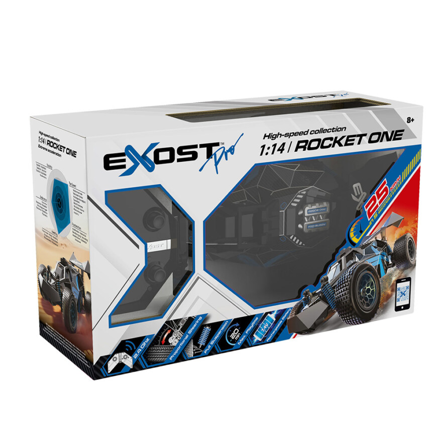 Upplev en fartfylld körupplevelse med Exost Pro Rocket One som har en toppfart på 25 km/h. Bilen är i skala 1:14, byggd för maximal fart, precision och kontroll. Den här maxade radiostyrda bilen drivs av en robust motor och är utrustat med ett avancerat fjädringssystem för en jämn och stabil körupplevelse, även på ojämnt underlag.