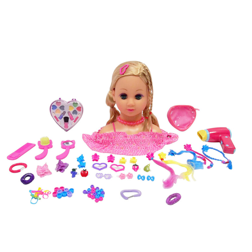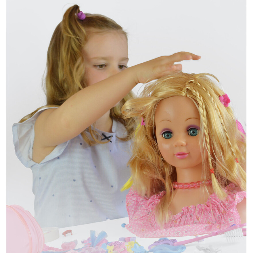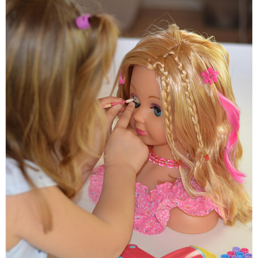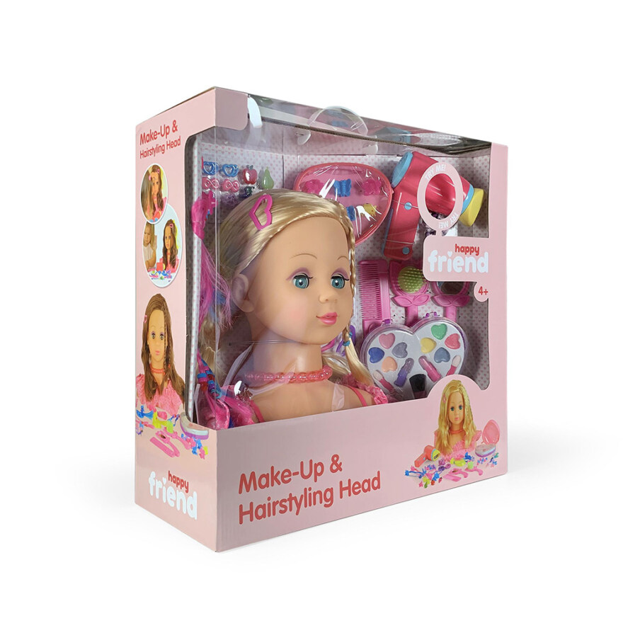 Sminkhuvud - Happy Friend. Utforska din kreativitet med detta sminkhuvud som kommer med allt du behöver för styling och makeup! Setet inkluderar en kam, hårspännen, lockrullar och makeup, perfekt för att skapa olika frisyrer och looks.