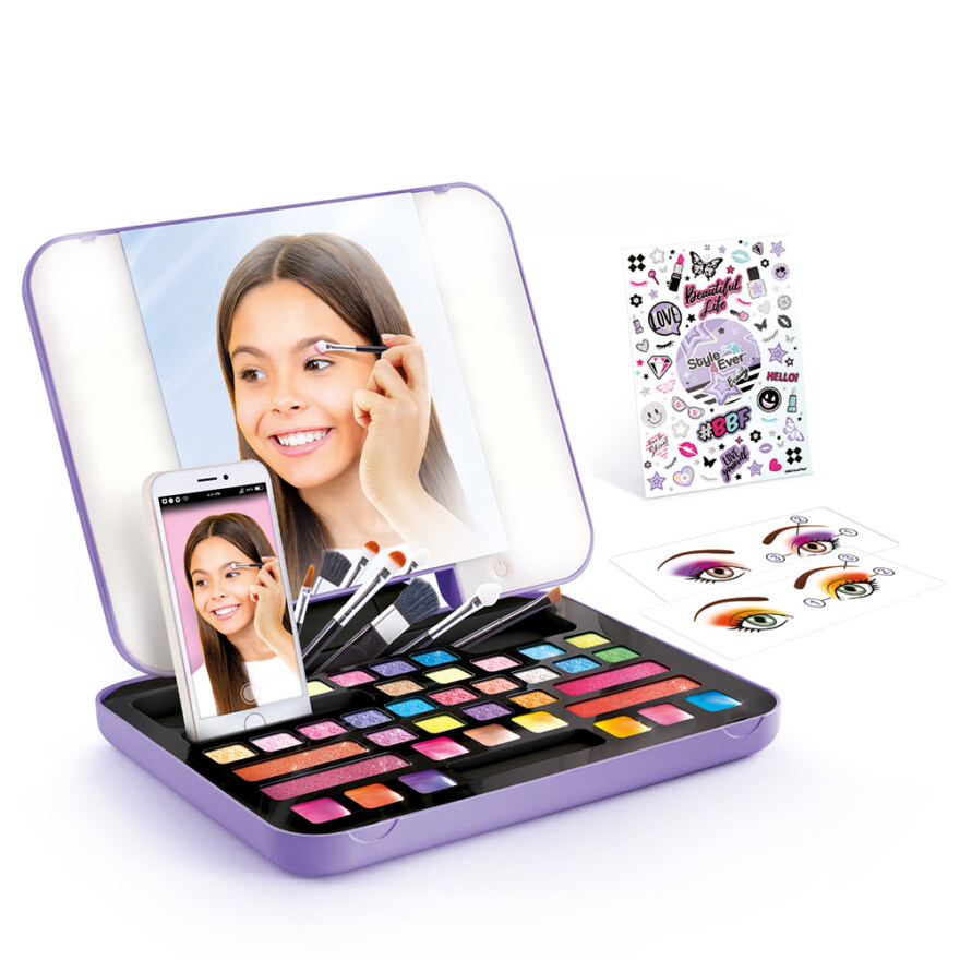Ett riktigt professionellt sminkfodral med LED-spegel. Skapa din helt egna stil och lär dig hur du applicerar makeup med de medföljande mallarna. Fodralet innehåller allt du behöver: ögonskuggor, läppglans, rouge och borstar, och är lätt att ta med.