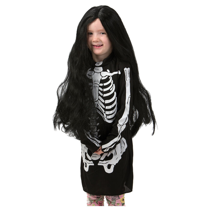 Svart peruk - barn – Barnperuk med långt svart hår. Perfekt för utklädnad och Halloween. Tillverkad av materialet PP (polypropen).