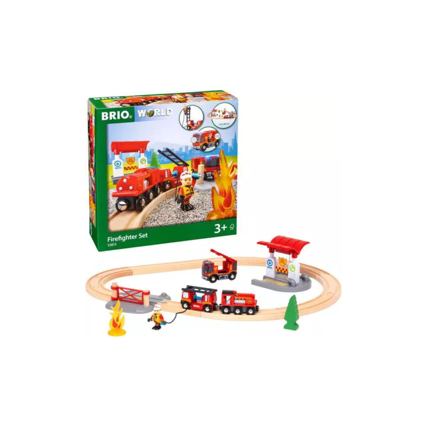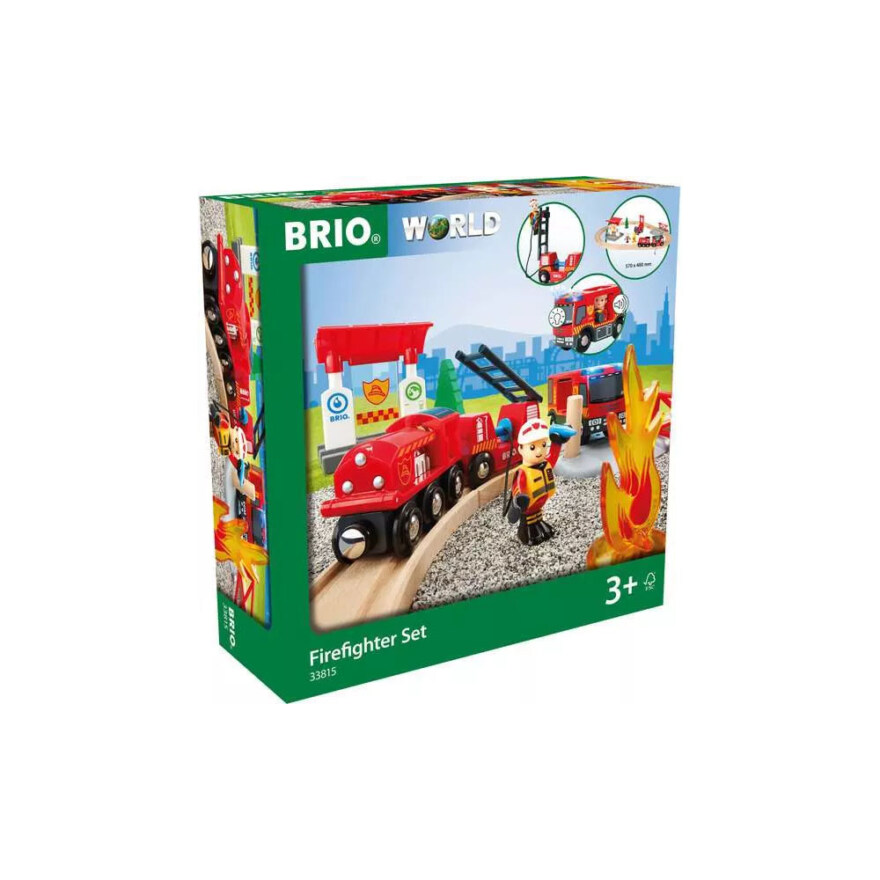 Tågset med brandmanstema - Släck bränder och rädda dagen! Tanka tåget och fyll på vatten på stationen. Kör brandbilen med sirenerna på och ryck ut tillsammans med brandmannen. Använd brandslangen på tågvagnen för att släcka elden. Bygg ut spåret och skapa fler spännande räddningsuppdrag!