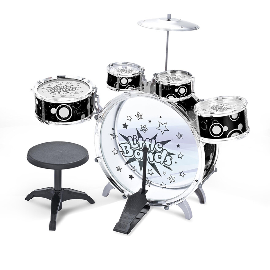 Även om man är liten, kan man skapa stora ljud. Lyxtrummor med inte mindre än 7 delar, inkl. stortrumma, hi-hat, fotpall m.m.