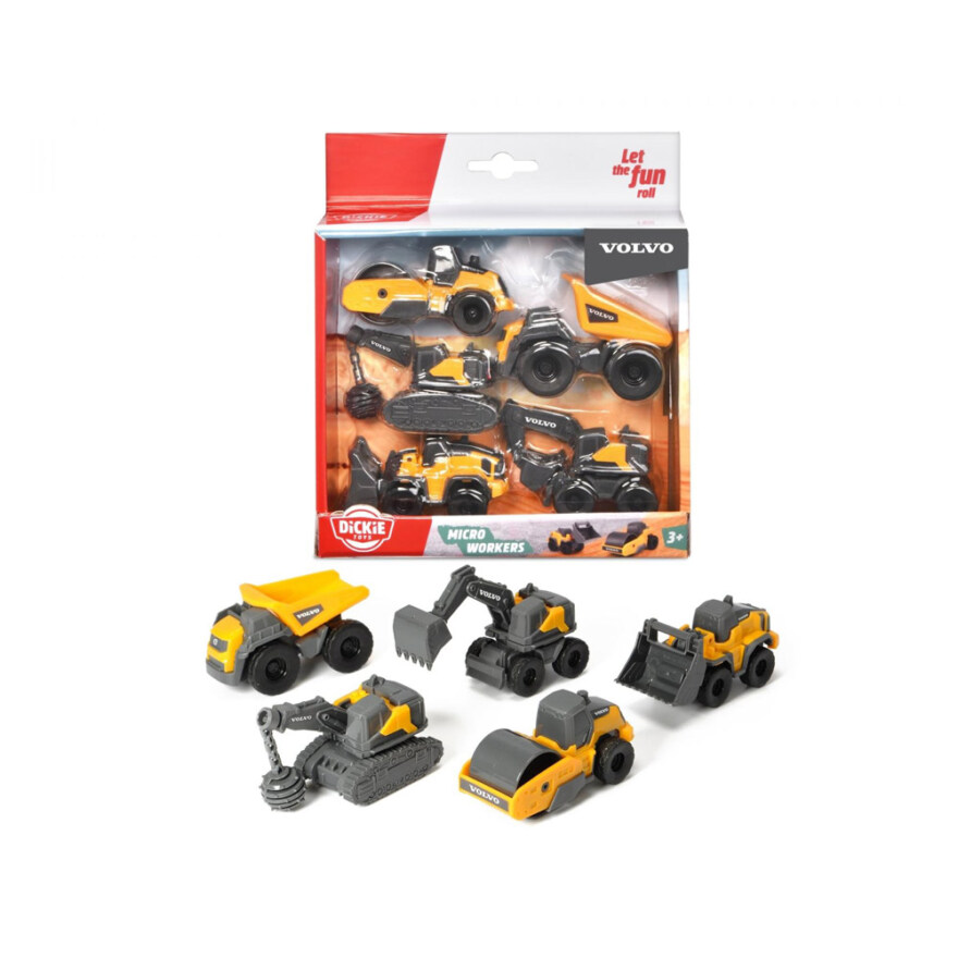 Volvo Micro Workers, 9cm låter barn skapa egna byggarbetsplatser med små och detaljerade arbetsfordon från Volvo. Kör ångvält, grävmaskin, dumper, rivningsfordon eller lastmaskin och utför olika bygguppdrag i leken. Rulla fordonen framåt, lyft skopan, tippa lasten eller låt rivningskulan svinga för att göra arbetet klart. De realistiska detaljerna och rörliga delarna gör leken extra spännande.